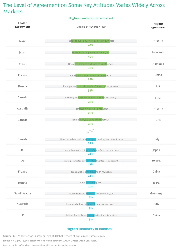 Instead, we found a world of remarkable diversity. While we detected strong similarities among consumers in the US, Canada, Australia, and the UK, for example, our analysis found that mindsets in every Asian market we studied are quite unique. European mindsets also aren’t as similar as we thought. In terms of specific attitudes, we found that Chinese consumers care deeply about how they are perceived by peers, but Russian and French consumers generally do not. And while Nigerians, Mexicans, and Indians are very keen to start businesses, Japanese consumers express little interest in entrepreneurship.