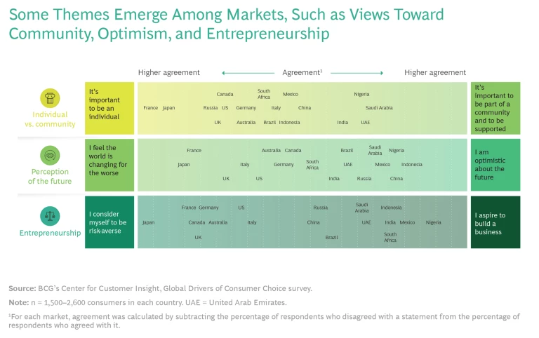 Several general themes also emerged from our analysis. One is that consumers in Middle Eastern and South Asian markets deeply value community. Another is that consumers in high-growth emerging markets were very optimistic about the future and interested in entrepreneurship.
