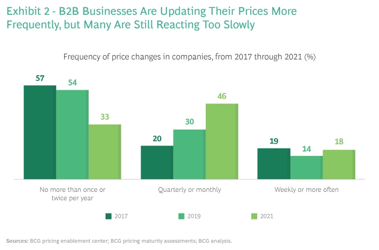Time lags for price changes are still standard practice at the majority of B2B companies, despite improvements over the last few years. Our pricing maturity assessment survey shows that while companies now change their prices at more frequent intervals than they did in 2017, some 33% still make adjustments on an annual or a semiannual basis. (See Exhibit 2.) Such rhythms are benign when economic conditions are stable, but they wreak havoc on margins when conditions become volatile.