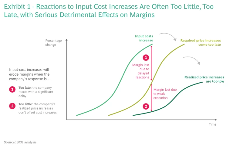 Act faster. Companies need to adjust their prices quickly when costs rise to avoid margin decreases. Let’s assume that a company wanted to offset cost increases with price increases that would keep margins constant. The longer the time lag between the cost increase and the decision to raise prices, the longer the company risks a decline in profit. (See Exhibit 1.)