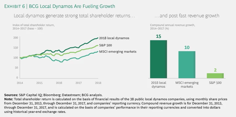 The local dynamos, as in previous years, have posted strong financial performance—particularly impressive in light of the more challenging external environment. An index comprising the 38 publicly traded dynamos generated total shareholder returns of 18% from 2014 through 2017, more than double the performance of the MSCI Emerging Markets (7%) and well above the S&P 500 (12%). A key driver of local dynamos’ strong returns was robust topline growth. From 2014 through 2017, that same group of local dynamos generated compound annual revenue growth of 15%, beating organizations on the MSCI Emerging Markets Index (10%) as well as the S&P 500 (2%). (See Exhibit 6.)