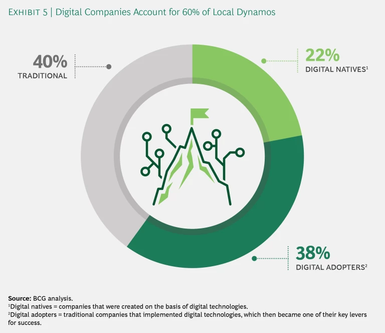 Overall, the companies on our list reflect an evolution in emerging-market economies away from low-cost manufacturers and toward more sophisticated, digitally enabled businesses. What’s more, this shift goes well beyond the internet and high-tech categories. Some 22% of the 2018 local dynamos are digital natives, and another 38% started out as traditional companies but have aggressively adopted digital technologies to enhance their competitiveness. (See Exhibit 5.)