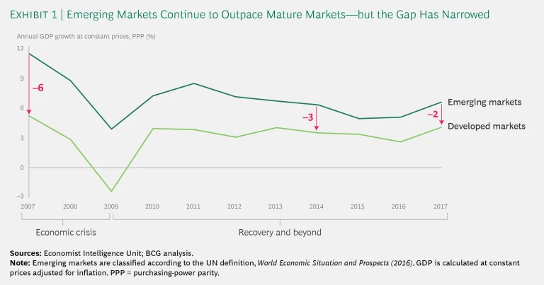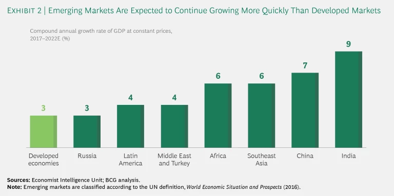 Economic growth in emerging markets has slowed in recent years, but it continues to exceed that of developed