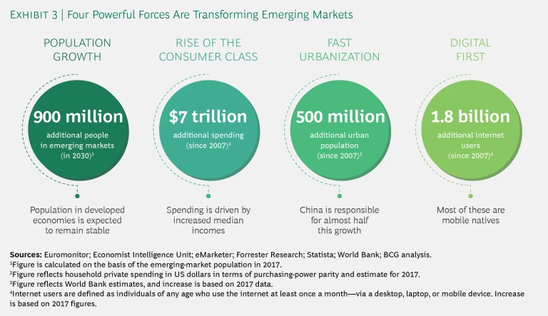 Within this setting, a number of developments are rapidly altering life—and the business landscape—in emerging markets. (See Exhibit 3.)