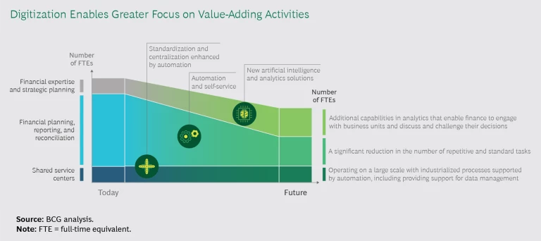 Over time, the greater use of AI and analytics allows the finance function to reduce the overall number of FTEs but still expand its capabilities. (See the exhibit.) The share of FTEs that perform repetitive, standard tasks will decrease, but the share of experts and strategic planners will increase. The activity in shared service centers will increase, but the number of FTEs in centers will remain roughly constant because much of the new activity is automated.