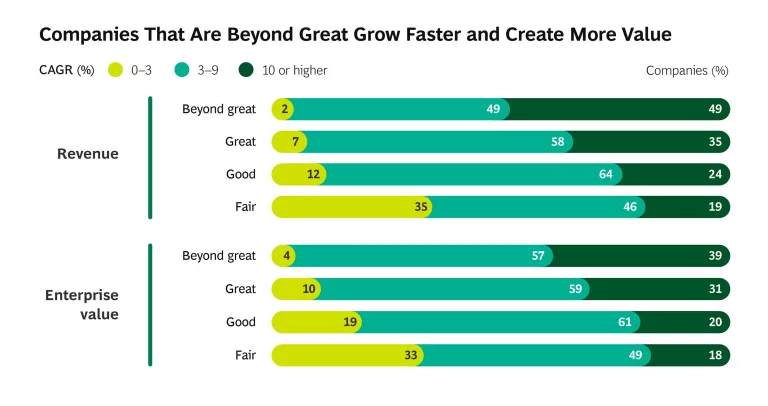 BCG’s new tool, the Beyond Great Index, helps companies answer a critical question: When it comes to embarking on the journey of building sustainable advantage, is the juice worth the squeeze? BCG surveyed leaders from approximately 2,400 companies representing all regions and industries worldwide to assess how ready companies are for the complexity of the current environment. We used the data from the survey to create composite scores reflecting performance in each of the nine strategies—results that show companies’ progress on the beyond-great journey. We found that companies with a high maturity score and the purposeful motivation to bring value to all stakeholders have accrued significant financial benefits. In other words, the juice is worth the squeeze.