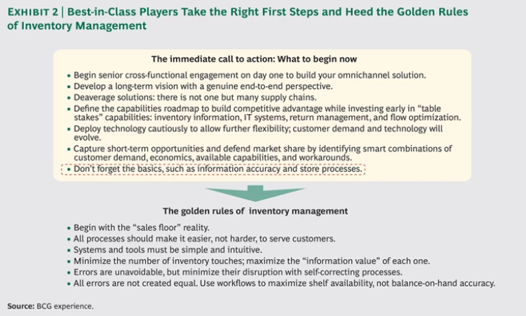 Why the poor performance? In support of their initial omnichannel offers, many retailers have chosen to focus first on building new infrastructure—pick-up points, distribution centers, delivery networks, IT systems, and even new stores. No doubt, these solutions can be critical components of a successful long-term omnichannel strategy, but getting the basics right, including in-store inventory, is often the most important first step to creating immediate impact and options for the future.