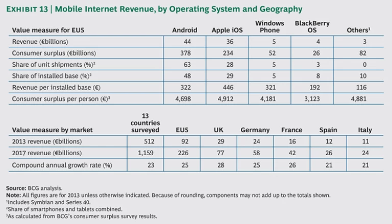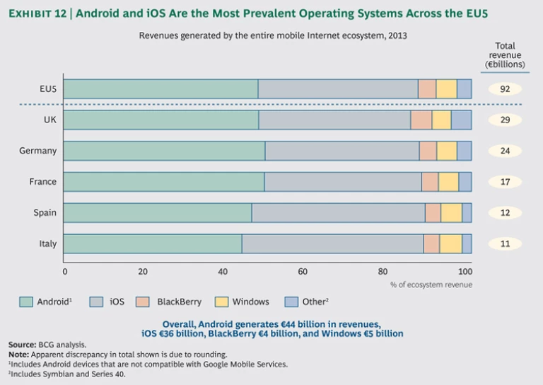 Today, Android accounts for 69 percent of devices sold in the EU5 and iOS accounts for 21 percent, while BlackBerry and Symbian have fallen to 4.2 percent and less than 0.5 percent, respectively. Android and iOS also account for most of the value generated in the EU5. (See Exhibits 12 and 13.)