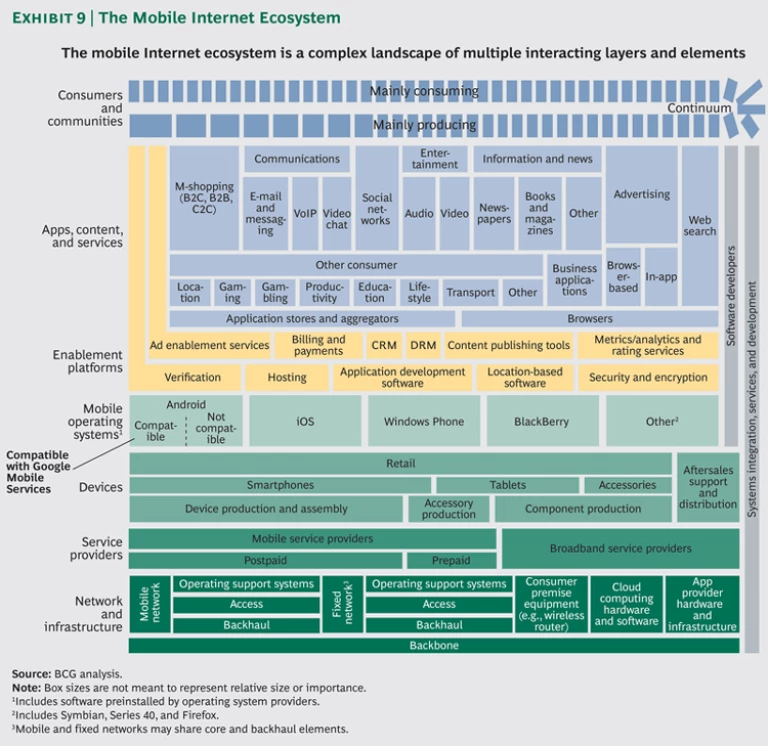 The mobile Internet ecosystem is big and complex, involving thousands upon thousands of individual companies and organizations that interact with one another in countless ways. Some of these entities are global in scale and reach, employing thousands of people and generating billions of dollars of revenue—telecommunications providers, device manufacturers, and software companies, for example. Many have multiple products, services, business units, and profit centers—think Apple, Google, and Amazon. Others are as small as an individual app developer working on a PC (or tablet) at his or her kitchen table.