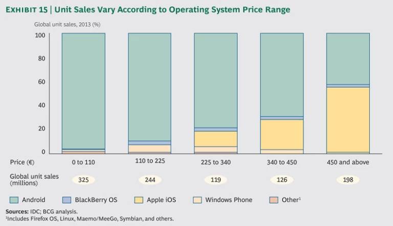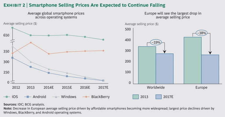 Competition among operating systems and their app ecosystems has also triggered an explosion in device development and sales, as well as in global mobile data traffic. In the EU, smartphones have rapidly come to dominate the mobile phone market as competition provides consumers and businesses alike with more choice, cheaper devices, and new products. Average smartphone selling prices fell 25 percent worldwide between 2011 and 2013 and are expected to drop a further 19 percent by 2017. In Europe, average selling prices are projected to fall even faster—by nearly 38 percent in 2017—for a variety of reasons, including market saturation and prolonged upgrade cycles. (See Exhibit 2.) In France, for example, Wiko devices (launched in 2012) sell for about €70 and captured nearly 7 percent of sales in 2013. Wiko expanded into the UK market in 2014.