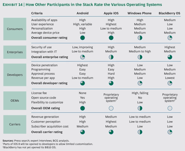 In recent years, competing operating system strategies have emerged, each with variations on open or closed models. Android grants OEMs full access to its operating system code. Windows is available on Microsoft phones and on those of licensed third-party OEMs. BlackBerry’s proprietary system is available only on BlackBerry handsets. Finally, Apple iOS is a vertically integrated operating system available only on iPhones and iPads. Industry participants debate which is preferable, and each offers advantages and disadvantages to consumers, device makers, and developers. The attributes of each determine how the company behind the operating system interacts with other participants in the stack. (See Exhibit 14.)