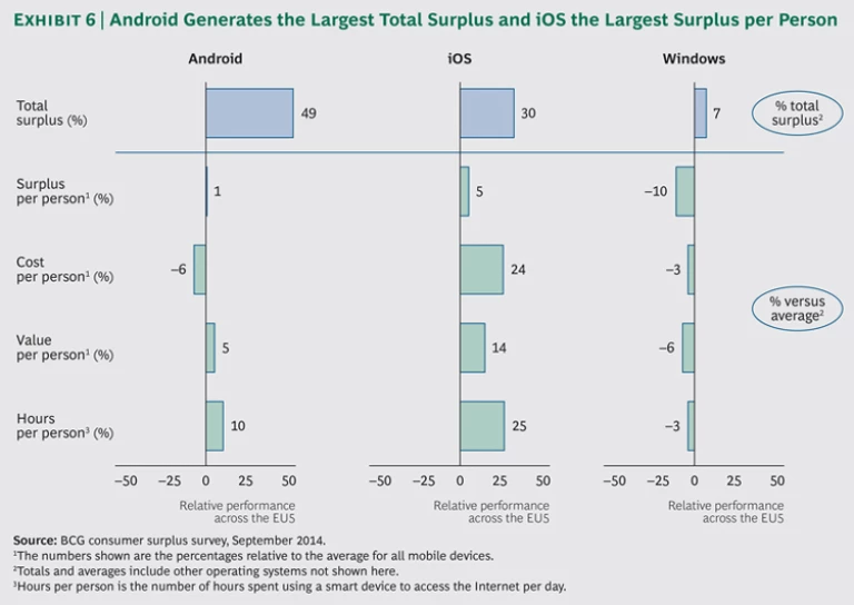German users generate the highest consumer surplus per person (€5,100), as well as the largest total consumer surplus in the EU5 (€199 billion). The UK has the second highest total surplus, followed by France. In Europe, as elsewhere, the Android operating system generates the largest surplus share, owing to the lower average cost—and generally high value—of Android devices and their resulting popularity. Apple’s iOS generates the largest surplus per person. (See Exhibit 6.)