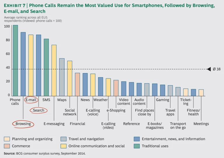 Consumers use their mobile devices for a wide variety of purposes. In Europe, the most valued feature is still phone calls, but this is followed closely by Web browsing, searching the Internet, and e-mail. Mapping capabilities, social networking, and financial functions are also very popular. (See Exhibit 7.)