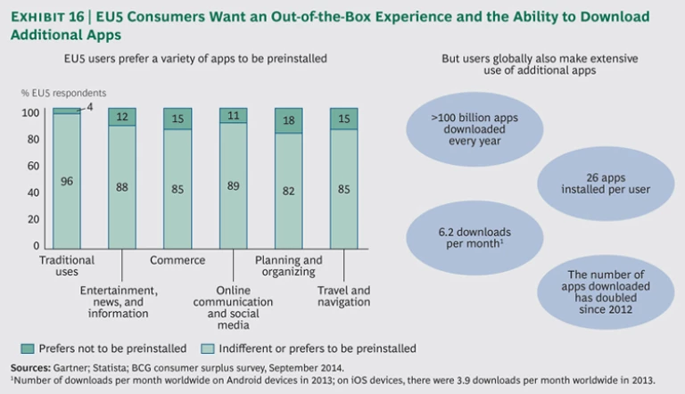 Whether the operating system is open or closed, consumers’ priorities are in certain respects consistent: they want a ready-to-go, out-of-the-box experience combined with the flexibility needed to download supplemental apps. (See Exhibit 16 for the preferences of consumers in the EU5.)