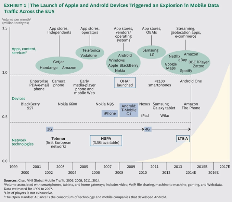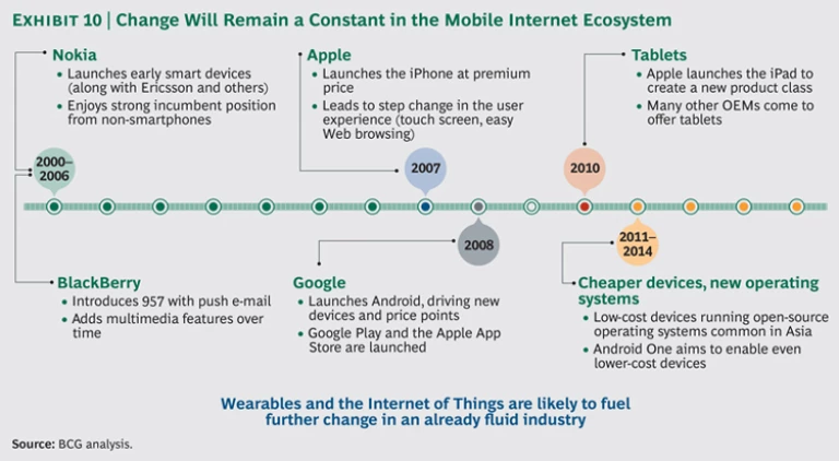 As the mobile revolution has gathered steam, intensifying competition in operating systems and technology has led to more and more innovations in smart-device functionality. Nokia and Ericsson (both European companies) launched the first smart devices with multimedia features in 2000. BlackBerry developed major advances between 2001 and 2007 with such innovations as push e-mail and encryption. The launch of Apple’s iOS and Google’s Android operating system led to a step change in the user experience with the widescale adoption of the touch screen and easy-to-use, full-featured mobile Web browsing, and the rise of third-party app ecosystems.