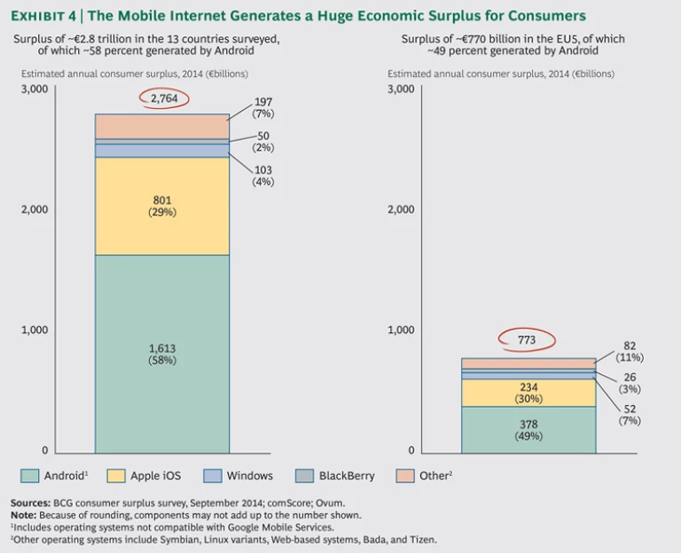 The revenue numbers measured in the previous chapter are large. But they pale in comparison with what must be considered the real value of the mobile Internet: what all this activity is worth to the end user. Consumers, especially European consumers, are the big winners here. And the margin of victory runs into the trillions of euros.