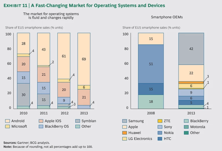 Nokia and BlackBerry accounted for more than two-thirds of smartphone sales in 2008. As recently as 2010, four major operating systems (Nokia’s Symbian, Google’s Android, Apple’s iOS, and BlackBerry OS) shared 93 percent of smartphone unit sales in the EU5—with BlackBerry and Symbian accounting for more than 45 percent. (See Exhibit 11.)