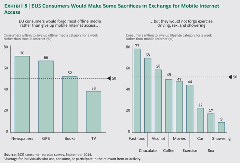It’s no exaggeration to say that consumers everywhere have come to depend on the mobile Internet. Whether it’s for communication, consumption, commerce, or information, they are loathe to give up the capabilities that the mobile Internet confers. Large majorities of Europeans and other consumers would forgo most offline media (the one exception is TV) before forgoing mobile Internet access. Substantial majorities are also willing to give up such luxuries as fast food, chocolate, alcohol, coffee, and movies. Europeans are somewhat more restrained when it comes to such trade-offs and are more likely to put a higher value on cars, sex, and showering. (See Exhibit 8.) A significant minority of consumers (14 percent in the EU5) are not willing to give up their mobile Internet access at any price. As one person put it, “The Internet is part of my body. I feel the Internet running in my blood. I’d rather give up something else than this.”