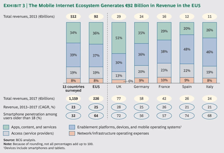By 2017, EU5 mobile Internet revenues will have more than doubled to about €230 billion ($300 billion)—an annual growth rate of 25 percent, which is comparable to the growth of these revenues in both China and the U.S. The single largest contributor to this growth will be the apps, content, and services component of the ecosystem, driven by the rapid expansion of mobile shopping and advertising. By 2017, we estimate that mobile Internet revenues will have grown to €1.16 trillion ($1.55 trillion) across the 13 countries surveyed, an annual increase of 23 percent.