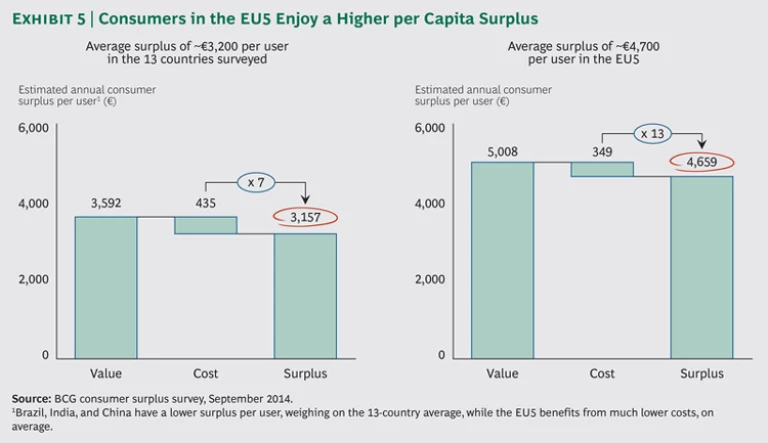 On a per capita basis, the average annual surplus in the EU5 is €4,700 ($5,900), almost 50 percent more than the €3,200 ($4,000) average surplus in the 13 markets surveyed. Europeans benefit from both lower costs and higher value. The surplus that consumers in the EU5 receive from the mobile Internet in terms of communication, consumption, commerce, and information is about 13 times what they pay, almost twice the average (of 7 times the amount paid) across the 13 markets. (See Exhibit 5.)