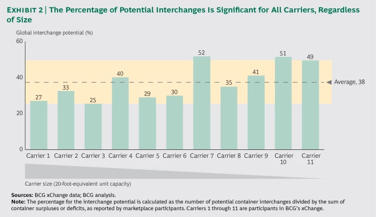 Data collected during the past year indicates that there are significant opportunities to interchange containers in all regions and for all carriers regardless of their size. From a regional perspective, the interchange potential for the marketplace has ranged from 15 percent of supply and demand imbalances in North America to 34 percent of such imbalances in Oceania. (See Exhibit 1.) From the perspective of the 11 carriers participating in the marketplace, the global interchange potential as a percentage of imbalances has ranged from 25 percent to 52 percent, with an average of 38 percent. (See Exhibit 2.) (The interchange potential on a regional basis does not include redundant opportunities for interchanges among carriers and thus is less in all cases than the global average for the 11 carriers.)
