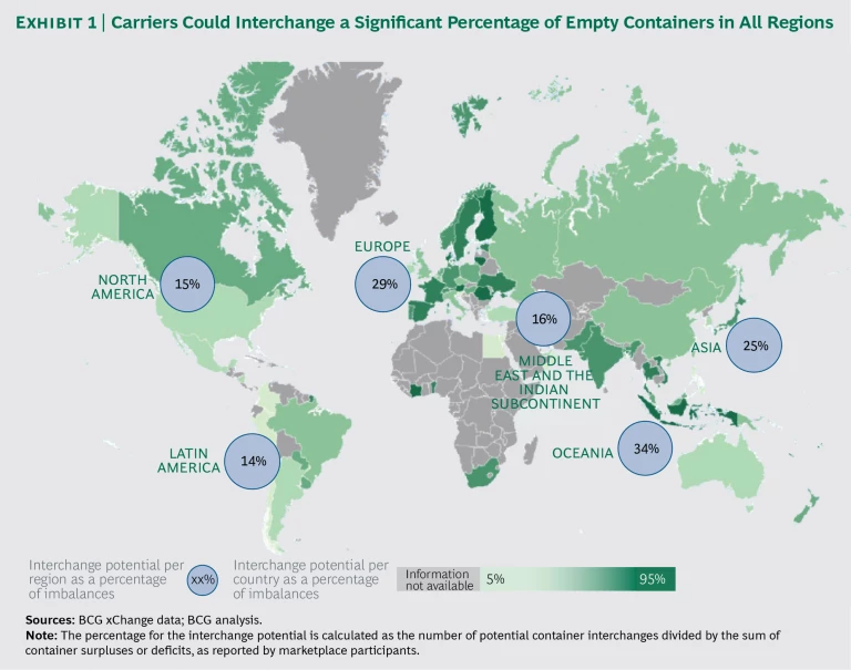 To help industry players collaborate more efficiently at scale, The Boston Consulting Group has developed a global interchange marketplace for empty containers: the xChange. This undertaking, as well as our work with many of the world’s top 20 carriers, has provided valuable insights into the extent of container imbalances globally and the opportunities for the container-shipping industry to use interchanges to overcome its repositioning challenges.