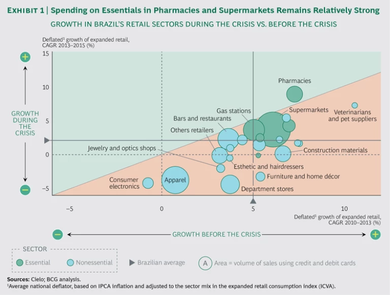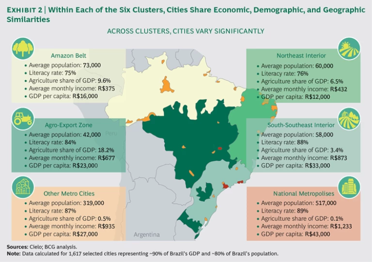 Recently, BCG and Cielo, Brazil’s largest credit- and debit-card payments processing company, undertook a major study of trends in Brazilian consumption based on a database of between 5 billion and 6 billion transactions per year from 2011 through 2015, involving 160 million credit and debit cards. We also analyzed dozens of eco­nomic and sociodemographic variables related to consumption in more than 5,000 cities and 137 (regions, as defined by the Brazilian government’s statistical institute, IBGE).2 2 To ensure adequate sample size, we focused on card data from cities with more than 10,000 inhabitants and more than 100 stores that accept electronic payments. Collectively, these cities represent more than 90% of Brazil’s GDP and 80% of the country’s population. We then applied statistical techniques to identify clusters of cities whose inhabitants reacted to the crisis with similar behaviors. The results show conclusively that traditional approaches to analyzing demand planning—approaches that rely on historic consumption data and municipal GDP trends—have significant limitations and therefore are unlikely to provide a complete or specific picture of where the real opportunities lie. Our analysis addresses this shortcoming.