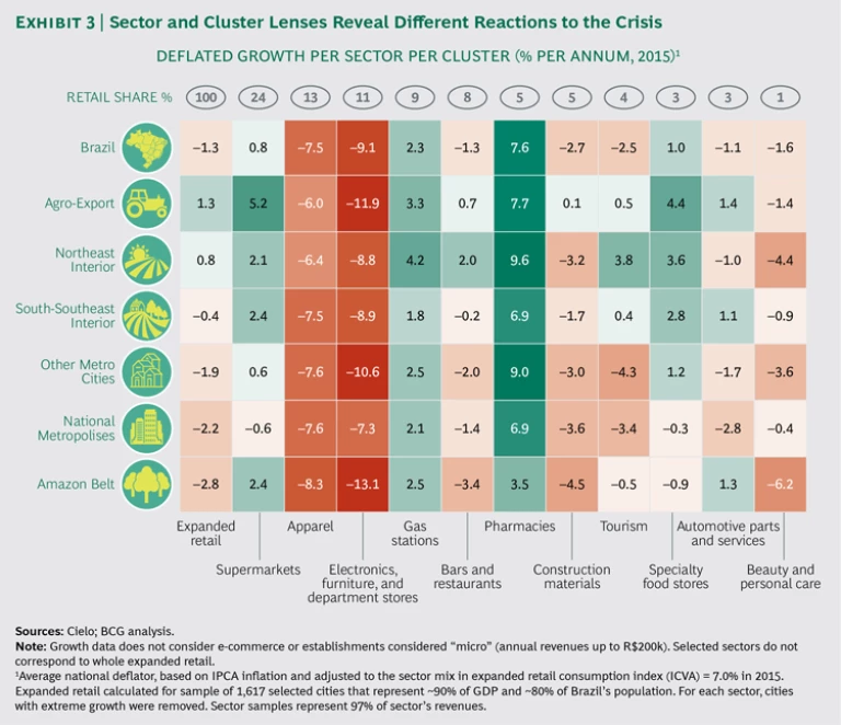 A comparison of growth rates by cluster and retail segment highlights Brazil’s highly heterogeneous retail spending landscape. (See Exhibit 3.) The impact of the crisis is evident, but it is far from evenly—or similarly—distributed. Most segments in the agro-export zone have continued to grow, but the national metropolises show few segments with positive growth, and the Amazon belt evidences broad and deep decline.