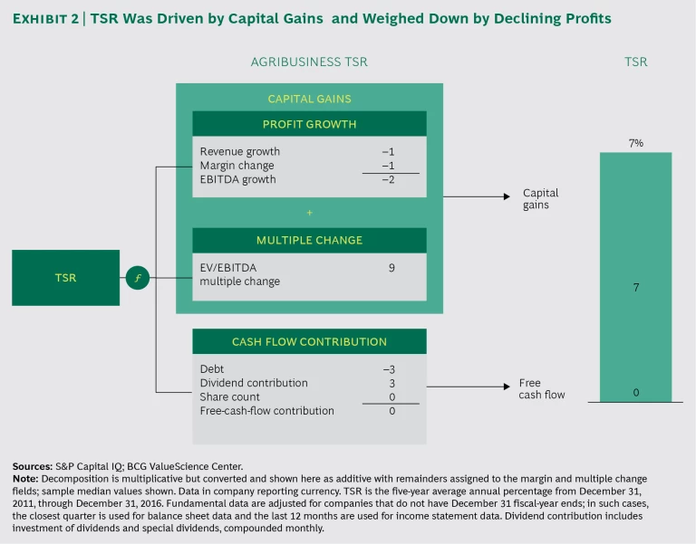 For the overall agribusiness sample, the valuation multiple—the ratio of enterprise value (EV) to earnings before interest, taxes, depreciation, and amortization (EBITDA)—contributed 9 percentage points to TSR from 2012 through 2016. The fundamental return (sales growth and margin change plus cash flow) reduced shareholder returns by 2 percentage points, producing the average annual TSR of 7%. (See Exhibit 2.) Negative sales growth and shrinking EBITDA margins reduced TSR for all subgroups, except processed-protein producers. Net debt increased by 67%, diluting TSR by 3 percentage points. The overall sample’s ratio of debt to EV increased from 0.2 to 0.3, while the ratio of debt to EBITDA—a common measure of company leverage—grew from 1.8 to 3.2.