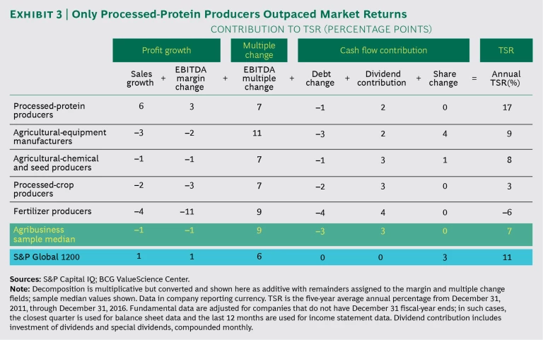 Among the five subgroups, only processed-protein producers outperformed the overall market in terms of average annual TSR from 2012 through 2016, while only fertilizer producers had negative TSR. (See Exhibit 3.) This performance reflects the dramatic shift in industry profit pools since 2011.