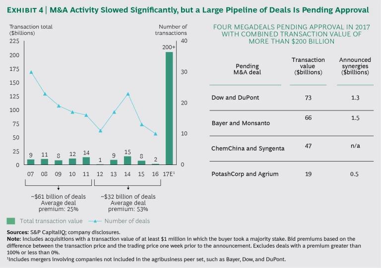 M&A activity reached a record high in 2011 but slowed dramatically thereafter among the companies in our sample, and the average deal size declined. Deal premiums doubled, on average, dampening the prospects for M&A-led value creation. M&A activity was especially subdued in 2016, with many companies appearing to be taking a wait-and-see attitude pending the approval of four megadeals. (See Exhibit 4.)