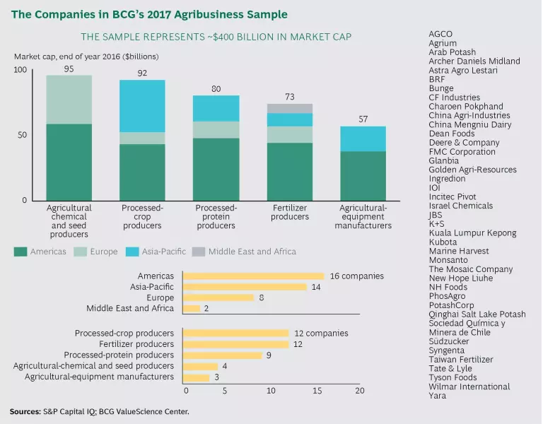 The BCG Value Creators sample of agribusiness companies consists of public companies that generate most of their revenues from the direct production of agricultural inputs (such as seeds) or outputs (such as processed meat). These 40 pure-play agribusiness companies include a mix of developed- and developing-market organizations with market capitalizations from $1 billion to more than $40 billion. (See the Appendix for a list of the companies in our sample.)