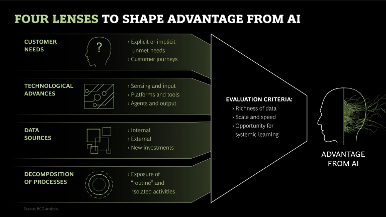 Executives need to identify where AI can create the most significant and durable advantage. At the highest level, AI is well suited to areas with huge amounts of data, such as retail, and to routine tasks, such as pricing. But that heuristic oversimplifies the playing field. Increasingly, all corporate activities are awash in data and capable of being broken down into simple tasks. (See the exhibit.) We advocate looking at AI through four lenses: