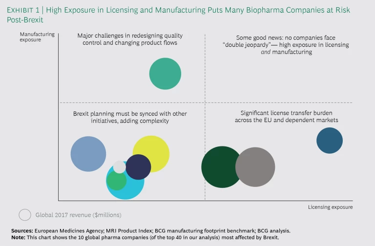 Biopharma companies are in various states of readiness for Brexit—understandable, given the prolonged uncertainty of the negotiations. But all feel the pressure to figure out how to prepare and what to prioritize. To understand the impact of a hard Brexit in two key areas for biopharma—licensing and manufacturing—we analyzed the top 40 global biopharmaceutical companies (by value). While we found that companies’ exposure in those areas varies considerably, all biopharma executives are being forced to make difficult strategic choices with limited guidance from policymakers. On the basis of our analysis and our work helping biopharma companies prepare for a new environment in Europe, we recommend some no-regrets moves that can mitigate risk in key areas.