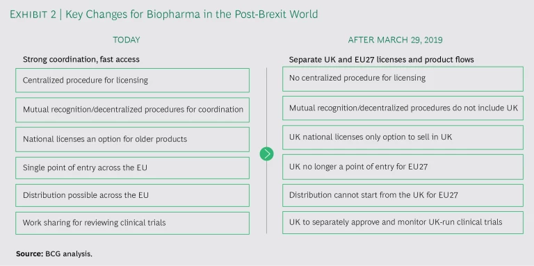 Biopharma companies will face changes in many areas post-Brexit. (See Exhibit 2.)
