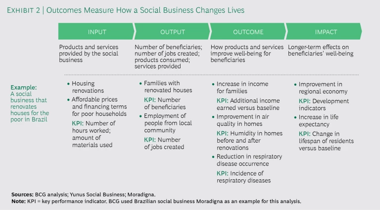 - Track outcomes to measure depth of impact. Although output makes for easy aggregation, it doesn’t provide the necessary insight into how a social business affects its customers and beneficiaries. Using Moradigna again as an example, output data showing that the business renovated 300 homes doesn’t tell us how the home renovations affected people’s well-being. But if we track outcomes, we can see that “humidity in homes decreased by X%” and “occurrence of respiratory disease was reduced by Y%.” (See Exhibit 2.) By collecting outcome data, the social business gets an opportunity to solicit feedback from beneficiaries, which can then be used to continuously improve the product or service. VPs can either directly or indirectly provide expertise and funding to generate data on outcomes. Armed with this information, social businesses and VPs can test key assumptions of their business models and drive their strategies forward to achieve the desired impact.