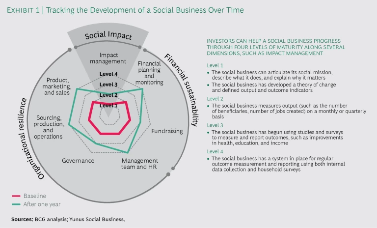 - Track the development of the social business’s capabilities. Once specific outcomes have been identified, the next step is to track progress toward them. By establishing a baseline for the business’s capabilities at the time of the investment, VPs get a clearer look at the maturity and development of the social business over time. (Exhibit 1 shows the framework YSB uses to build capacity within its social businesses and illustrates the four levels businesses would move through as their impact management matures.) We recommend that VPs include these baseline and maturity assessments in their fund’s regular portfolio review. Investment managers can also use these assessments as a powerful tool in day-to-day interactions with social businesses. For example, when one of its social businesses experienced some difficulty with financial reporting, YSB connected it with a seasoned accountant who helped set up robust financial systems and easy-to-use accounting tools. This not only improved reporting but also allowed the social business to gain insight into its finances in real time.