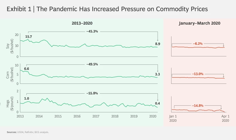 But several years of high yields, followed by the US-China trade war, led to a steady decline in prices, and by January 2020, they were down an average of 50% from their 2013 highs. As a result, the industry’s value creation suffered: compared with 2013 levels, value-added farm-gate output in 2019 fell by 14% in Europe, 20% in the US, and fully 37% in Brazil. And since the COVID-19 crisis began, commodity prices have fallen another 6% to 15%, accelerating the ongoing downturn. (See Exhibit 1.)