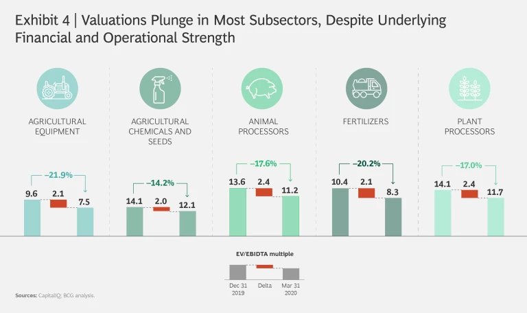 Inorganic Growth. The COVID-19 pandemic has caused valuation multiples of agriculture companies to drop as much as 20%, depending on the subsector. Yet the fundamental business performance of many players remains strong. (See Exhibit 4.) This offers both strategic buyers and financial investors the opportunity to purchase significantly undervalued but operationally robust businesses at a considerable discount compared with average valuations or to pick up smaller businesses in need of cash.