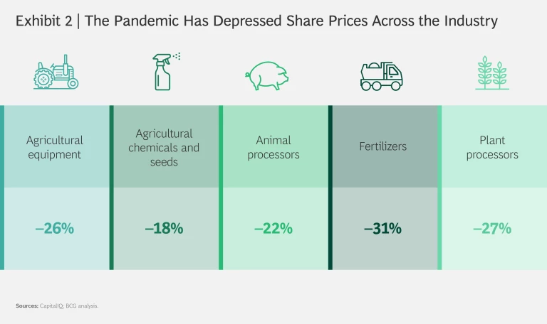 Then came the COVID-19 pandemic. During the past few months, share prices for agriculture companies have fallen across the board, with fertilizer producers and crop processors taking the biggest hits. (See Exhibit 2.)