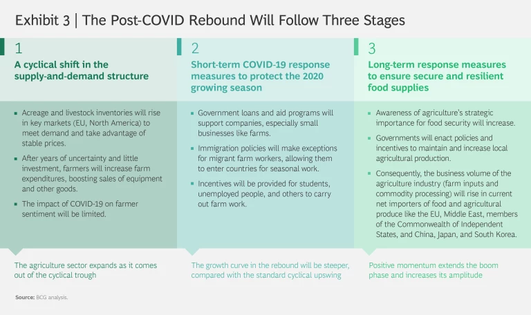 Taken together, these trends suggest that on a global level the agriculture industry will see a somewhat V-shaped recovery, varying by segment and region, once the adverse effects of the COVID-19 pandemic subside. (See Exhibit 3.)