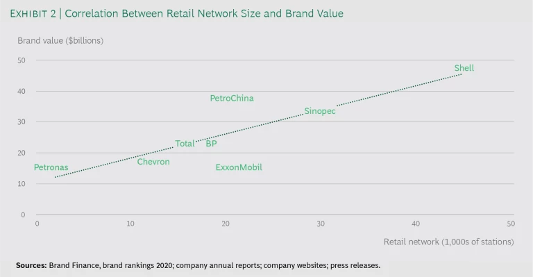 Boost brand and enterprise value. Fuel retail is a brand builder for oil companies. It reinforces brand and has marketing synergies with other business lines such as lubricants. Our analysis finds a direct correlation between the global size of a company’s retail network, as measured by the number of service stations, and brand value, as determined by independent agencies. (See Exhibit 2.)