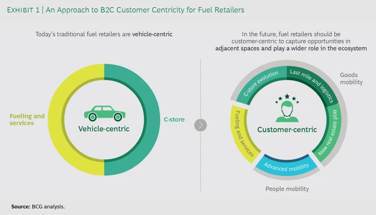 Fuel retailers have increasingly focused on building out their nonfuel offerings, using daily touch points to address B2C and B2B customer needs. Digital solutions enable retailers to further monetize these millions of daily touch points, transforming fuel retail from a vehicle-centric model to a customer-centric model and expanding their accessible value pools. (See Exhibit 1.)