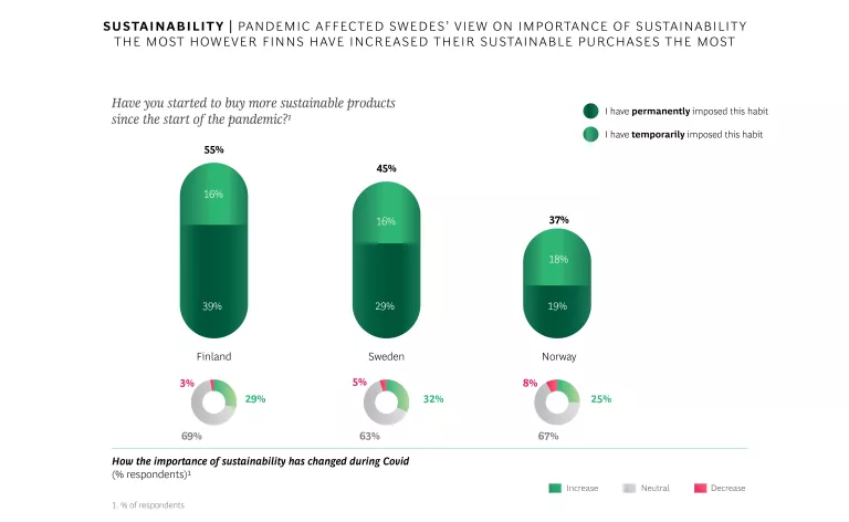 Compared to our Nordic neighbors, the pandemic has affected Swedes' view on the importance of sustainability the most with 32% increase in Sweden compared to 29% in Finland and 25% in Norway.