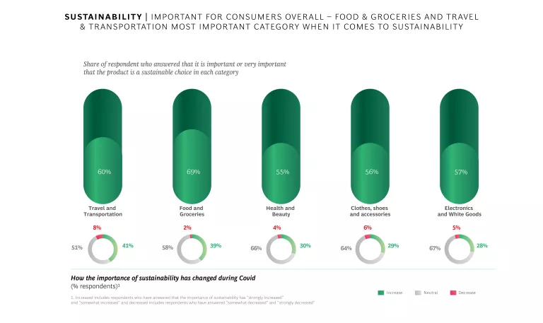 This goes hand in hand with a recent global BCG consumer survey, The Pandemic is Heightening Environmental Awareness, that showed that 70% of survey participants said they were more aware that human activity threatens the climate compared to before the pandemic. The global survey also found that 90% were equally or more concerned about environmental issues compared to the start of COVID-19.