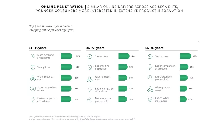 Since time savings emerged as the most important factor for the older generation, it’s evident that convenience is what’s needed to appeal to this target group. For the younger generations on the other hand, many other benefits are viewed to be highly important. Younger people seem to be more interested in product information than the older generation; doing research before a purchase is important to ensure that products provide good value-for-money. Thus, to target this consumer group, it’s important for any e-commerce offering to include extensive product information and, where applicable, allow for leaving product reviews.