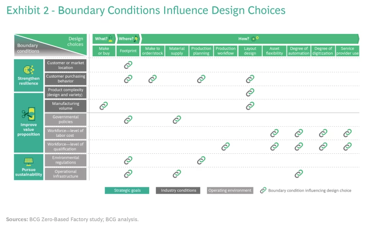 A company must decide how to prioritize value, resilience, and sustainability in order to enhance its competitiveness. To do this, it must assess its boundary conditions, which encompass its strategic goals, industry conditions, and operational environment. These conditions influence tradeoffs and priorities for design choices. (See Exhibit 2.)