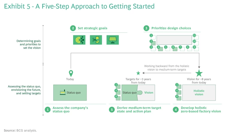Implementing a zero-based factory begins with taking a clean-sheet approach to designing a holistic vision of optimal operations. A company can then identify the potential for improvement on each design choice relative to the existing network and determine how to close the gap between its legacy operations and the zero-based vision. The process entails five main steps (see Exhibit 5):