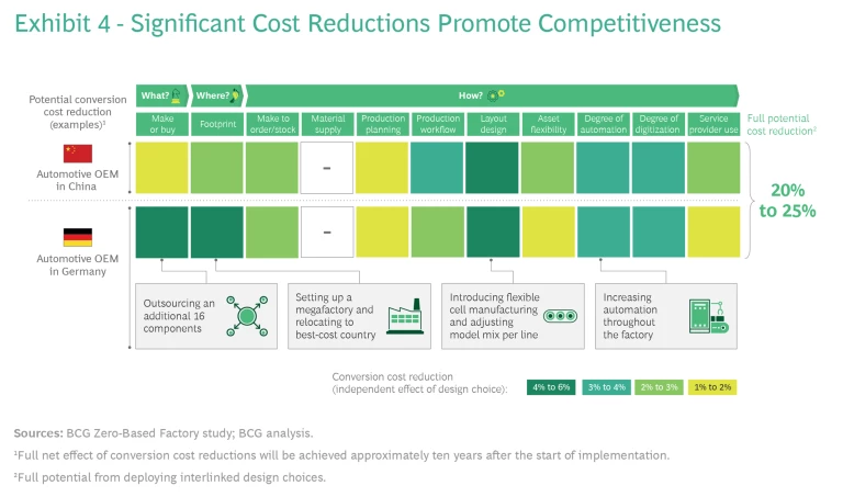 Exhibit 4 summarizes potential conversion cost reductions for automotive OEMs based in Germany and China. Each design choice can reduce conversion costs by 1% to 6%. In combination, the design choices can drive extraordinarily high conversion cost reductions, totaling 20% to 25%.