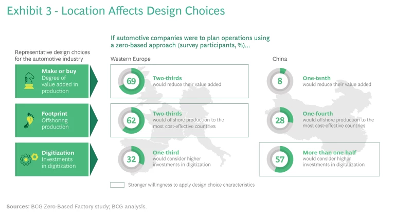 The results from automotive participants in Western Europe and China provide insights into the influence of location on design choices. (See Exhibit 3.)
